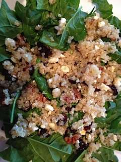 Hi everyone, thought I would share my quinoa salad I made for dinner last night. I picked the spinach, garlic scape, and thyme from my garden. It was so delicious and satisfying. The ingredients used in my salad: spinach, quinoa, cranberries, pecans, feta cheese, red onion, served with an orange dressing. Cook the quinoa in a chicken broth and add a garlic scape to the water. Once the quinoa is cooked, set aside in a bowl to cool to room temperature. The orange dressing is really basic, add 6 1/2 tbsp orange juice, 2 tsp orange zest, 2 1/2 tbsp olive oil, 1 1/2 tsp thyme leaves, salt and pepper to taste. The measurements for the dressing are approximate depending on how large the salad is. Lay the spinach on the plate, combine all other ingredients together and toss with the orange dressing. Hope you enjoy.